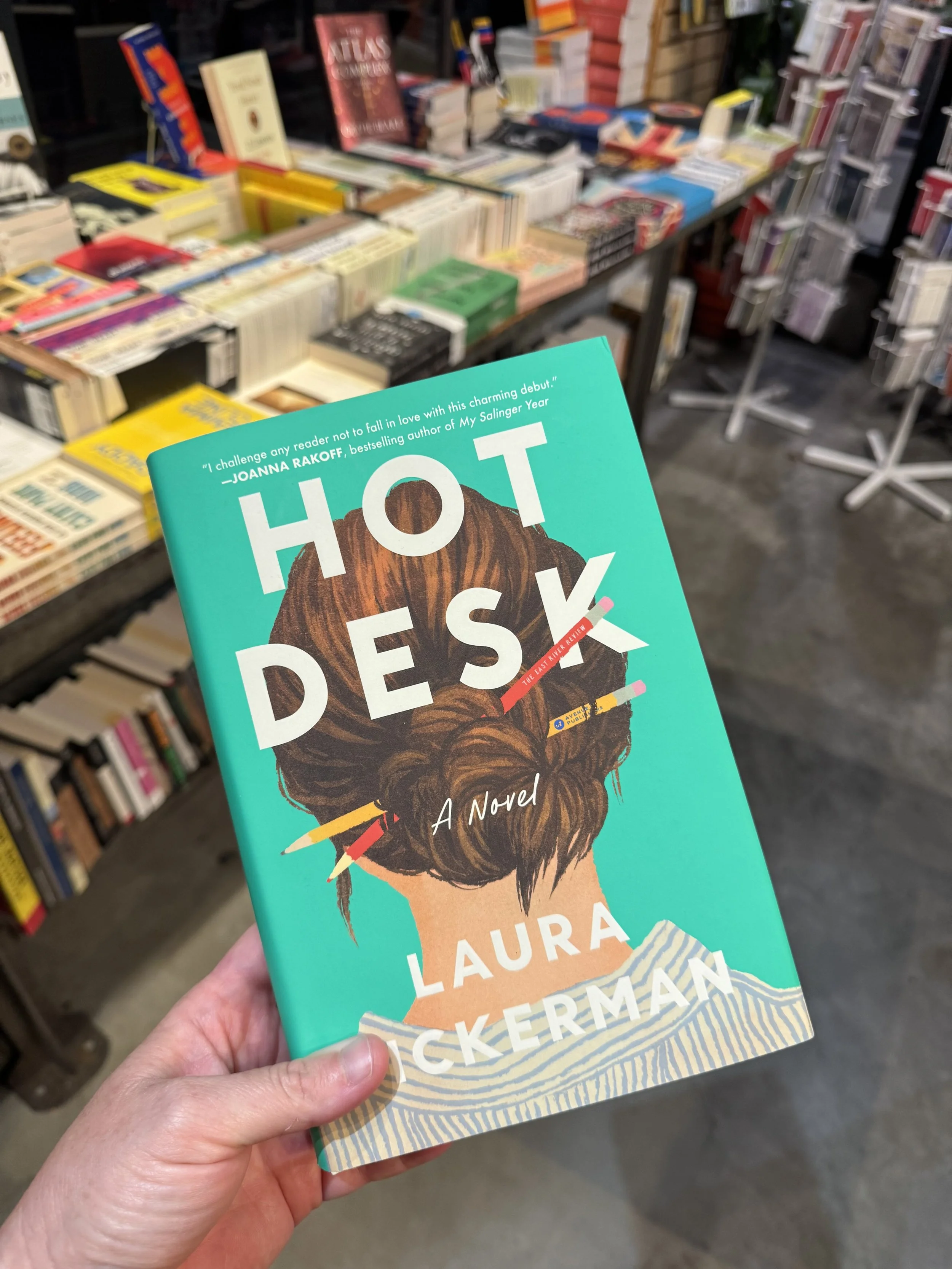 Of course, I had to purchase at least a little something at said swoonworthy bookshop. So I picked up a debut novel by Laura Dickerman called Hot Desk. I know literally nothing about it. I bought it for three little reasons — the cover is gorgeous, the blurb is good, and I love, love, love buying debut novels.